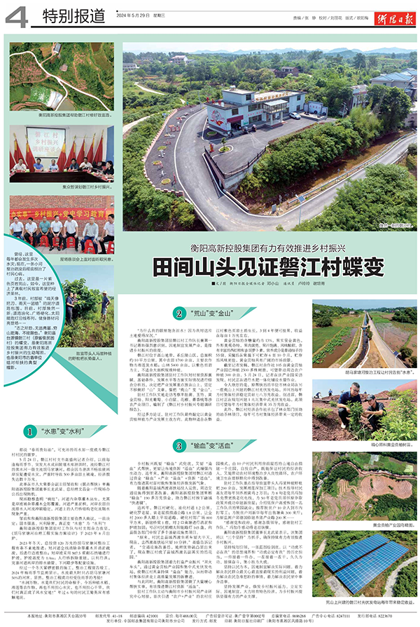 “輸血”變“活血” 鄉(xiāng)村振興既要“輸血”式兜底,又要“造血”式幫扶,更要讓當?shù)刭Y源“活血”式增強內生動力。近年來,衡陽高新控股集團對磐江村通過資金“輸血”+產業(yè)“造血”+資源“活血”,有力推進其村容村貌和集體經濟煥發(fā)新氣象。